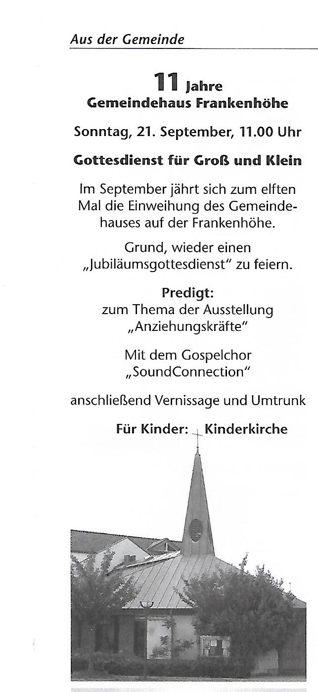 21. September: Jubiläumsgottesdienst 11 Jahre Gemeindehaus auf der Frankenhöhe mit Vernissage