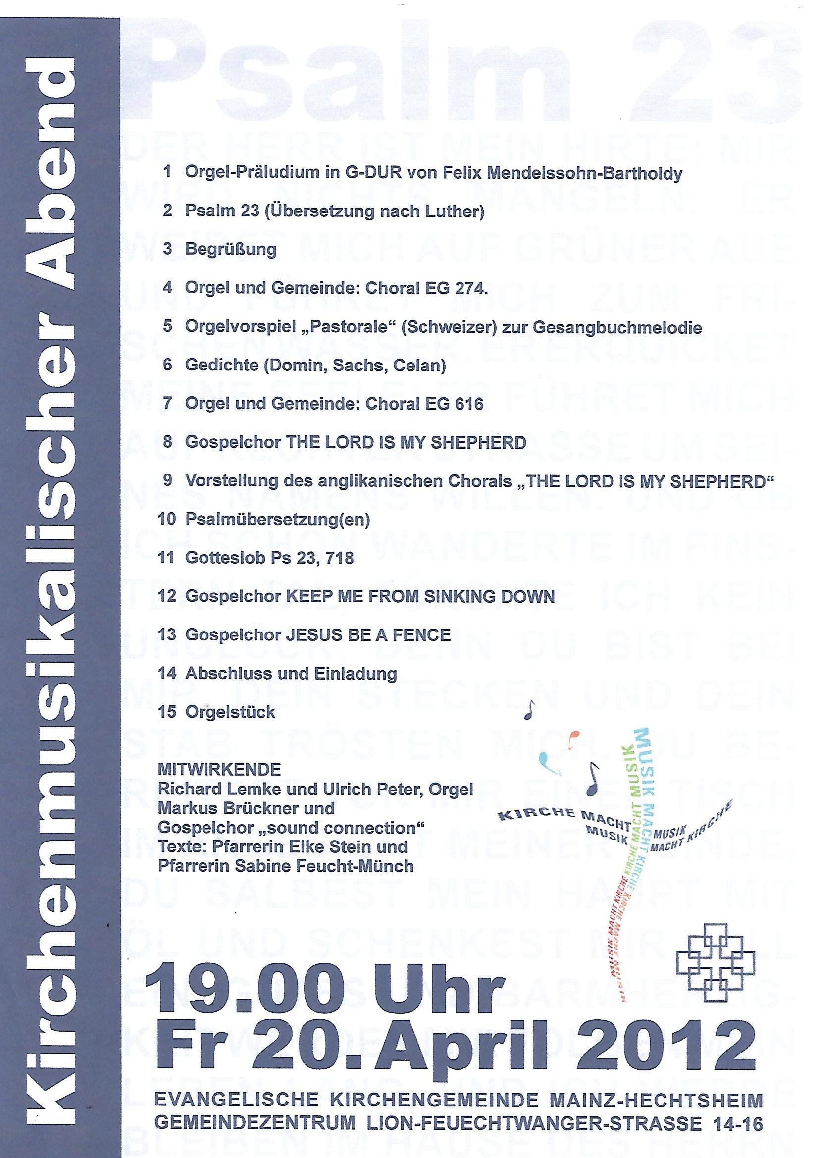 20. April: Kirchenmusikalischer Abend zum Thema Psalm 23