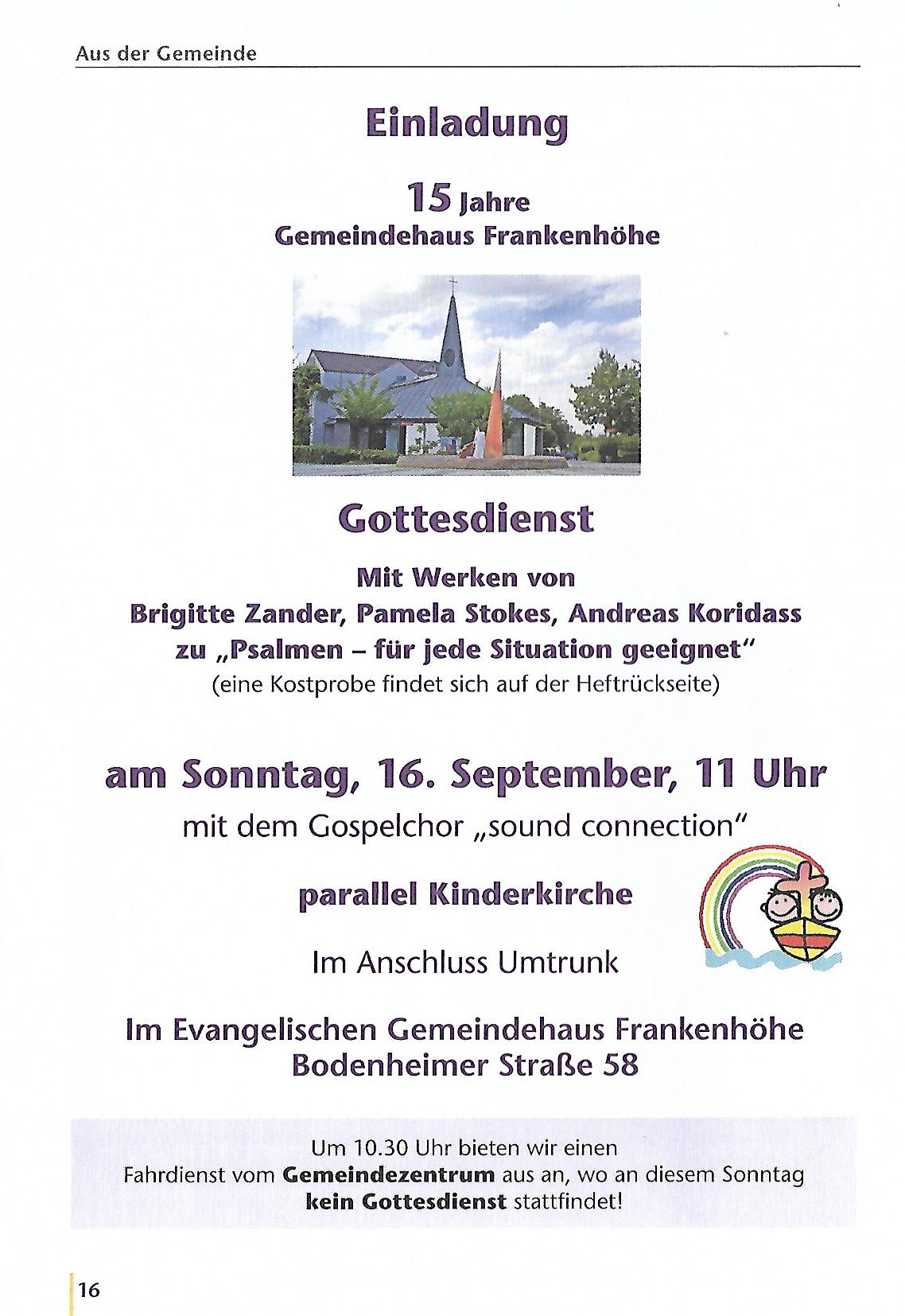 16. September: Gottesdienst Jubiläum 15 Jahre Gemeindehaus Frankenhöhe